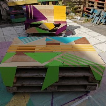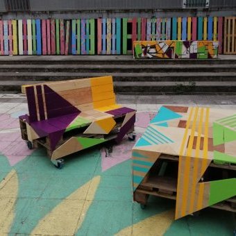 Création participative de mobiliers urbains pour le jardin du CSC Romain Rolland à Saint Denis, avec bois de récupération type palette.