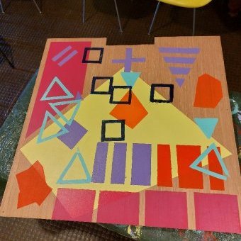 - 1 - Composition graphique avec scotchs de masquage et peintures acryliques au rouleau : création par enchevêtrement de lignes directement sur le support.