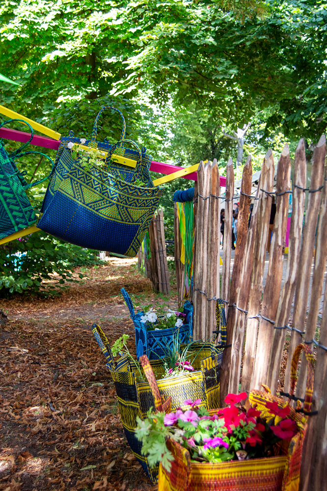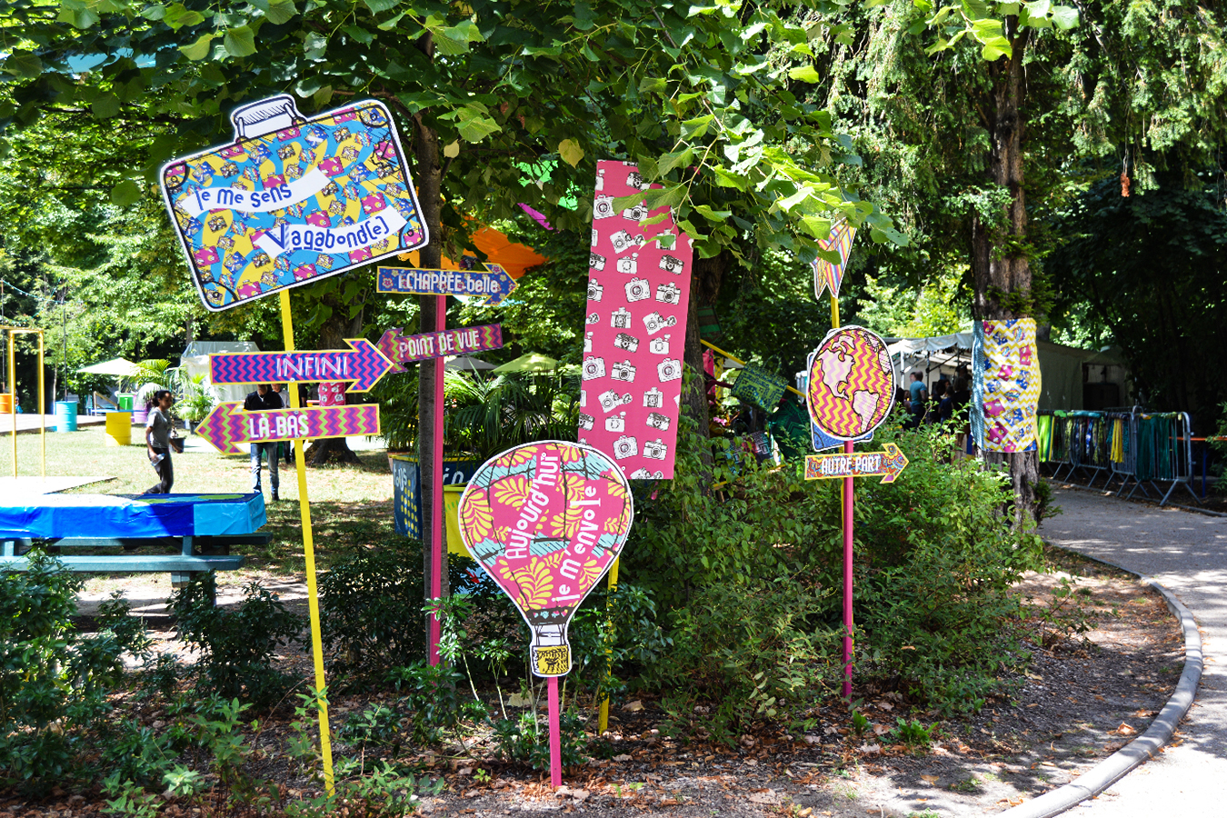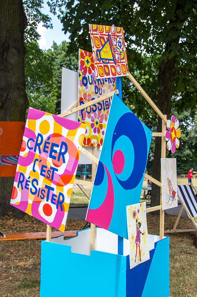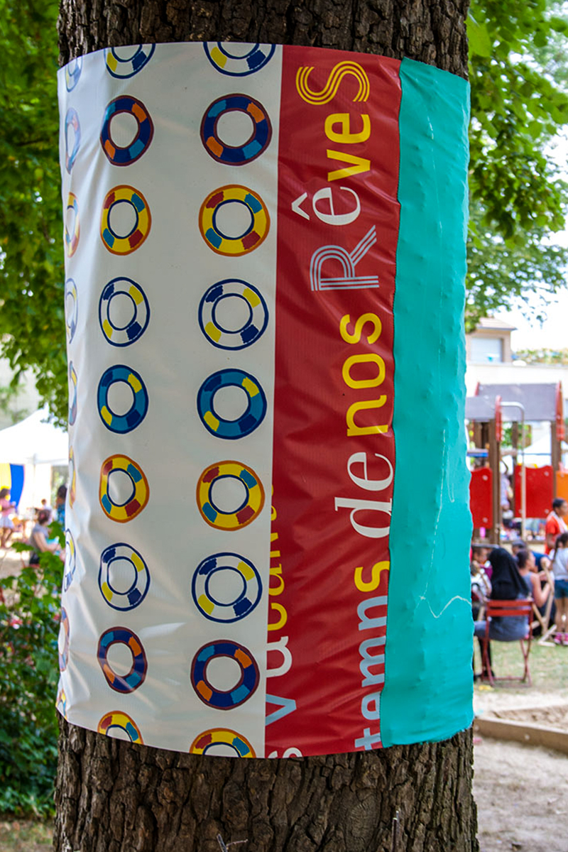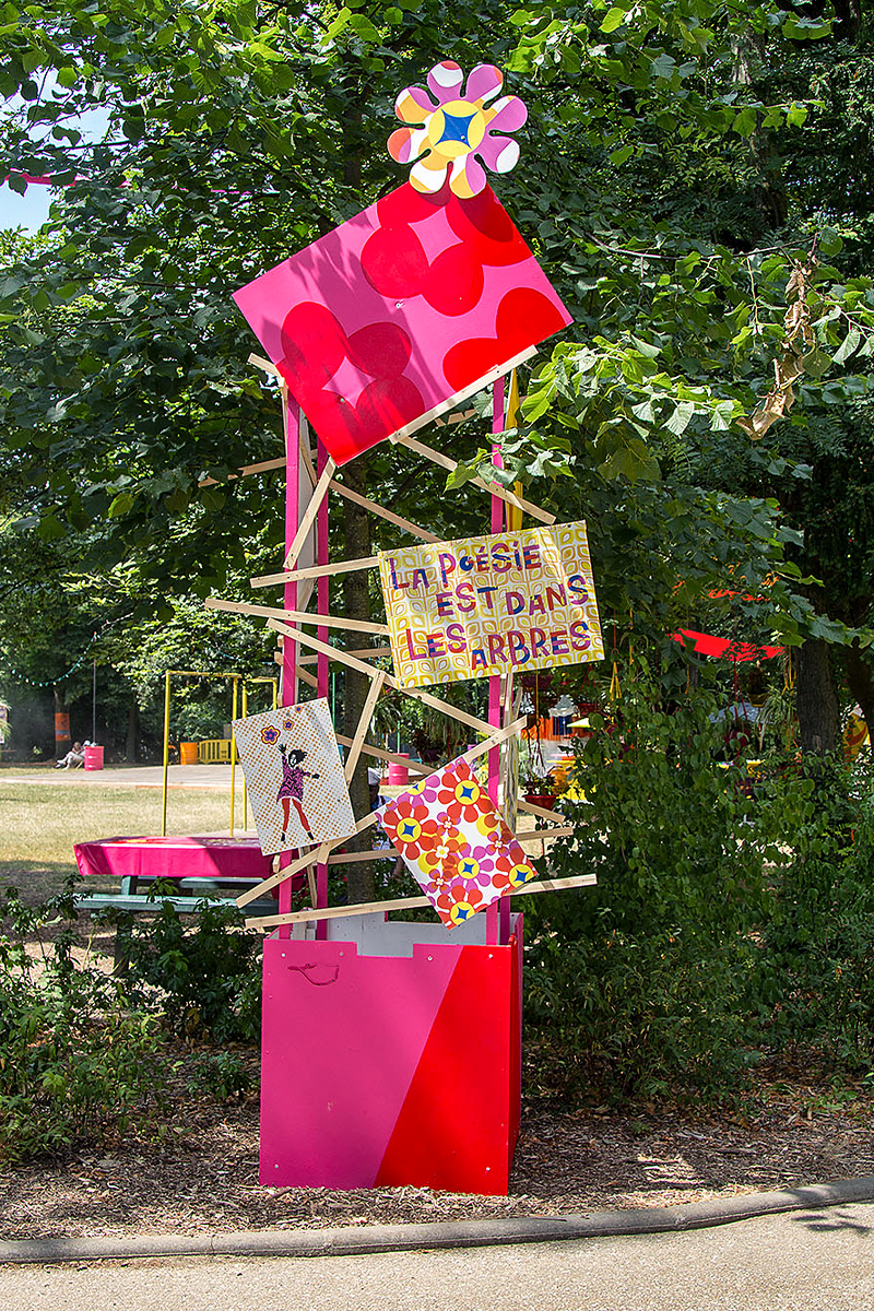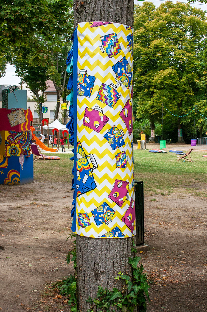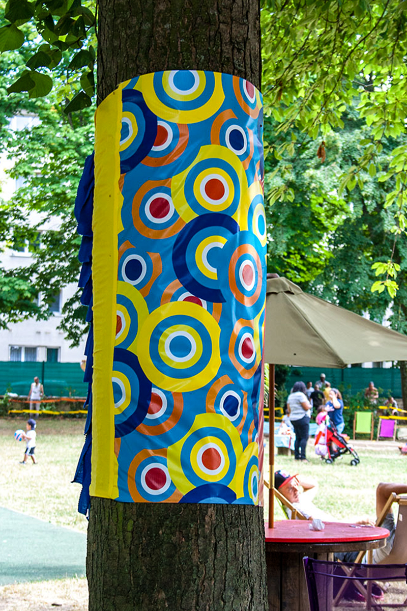 habillage de la totalité du parc dans ses espaces aménagées et ses objets naturels présents ({arbres, toiles à chaises longues, coussins, linéaires, Portes d'entrées, espace protégé, oeuvres totémiques tissées, voiles d’ombrage, chevalets ardoises})Artiste(s) et intervenant(s)