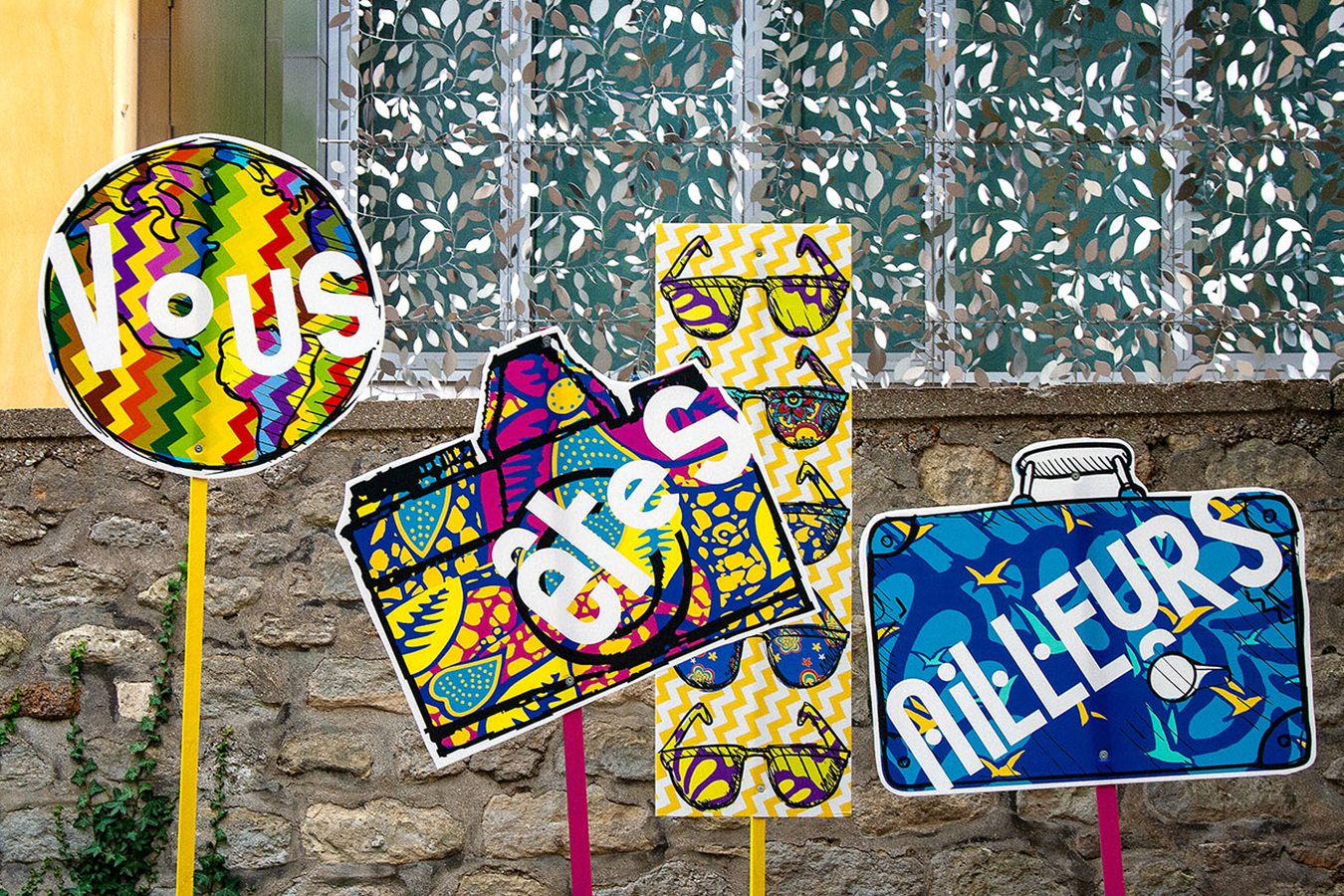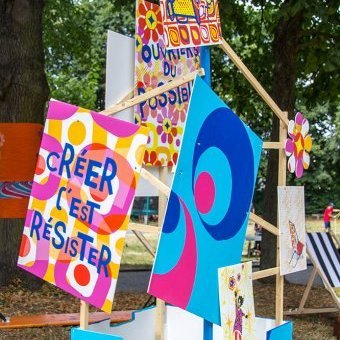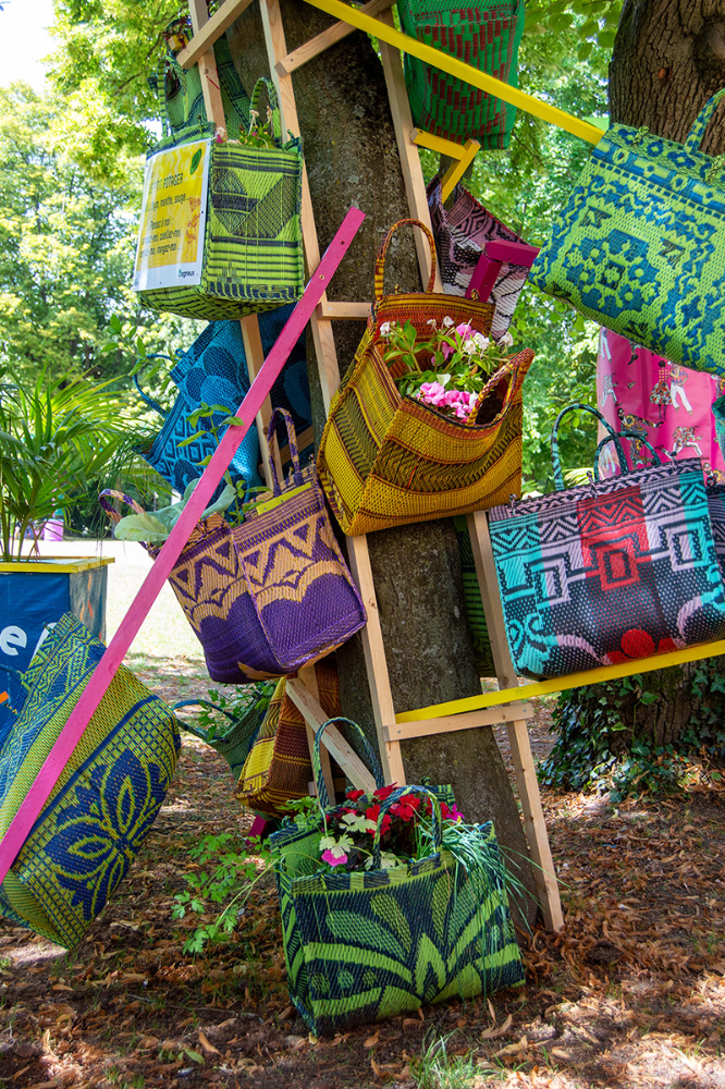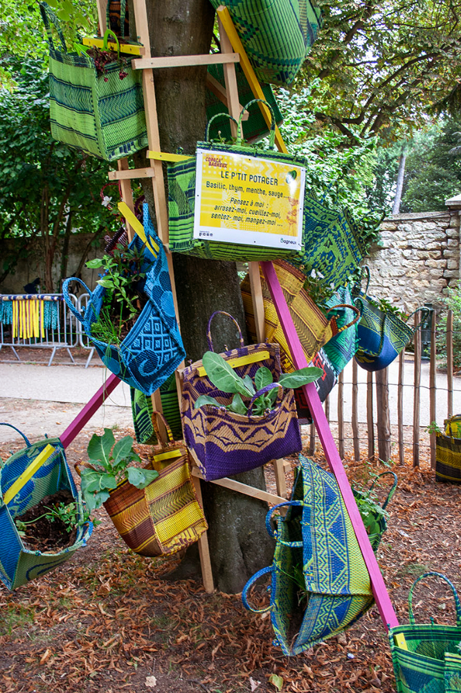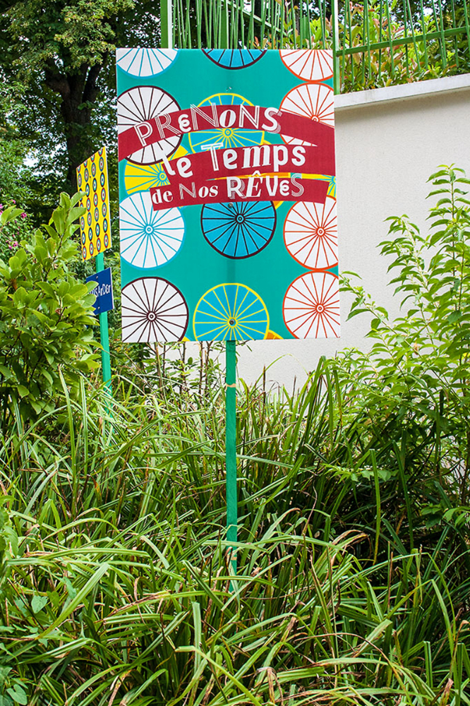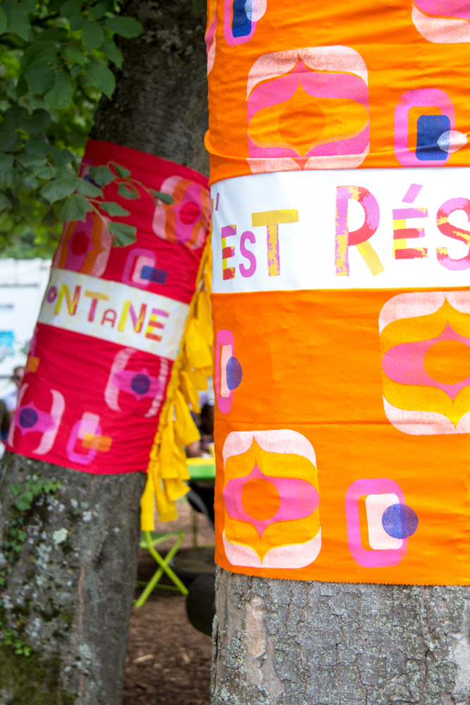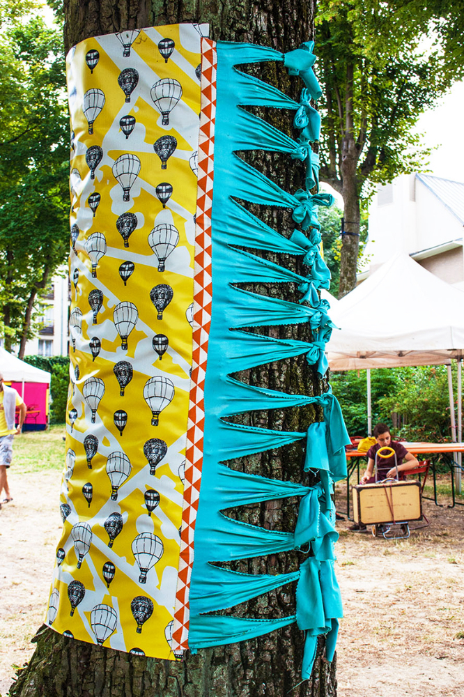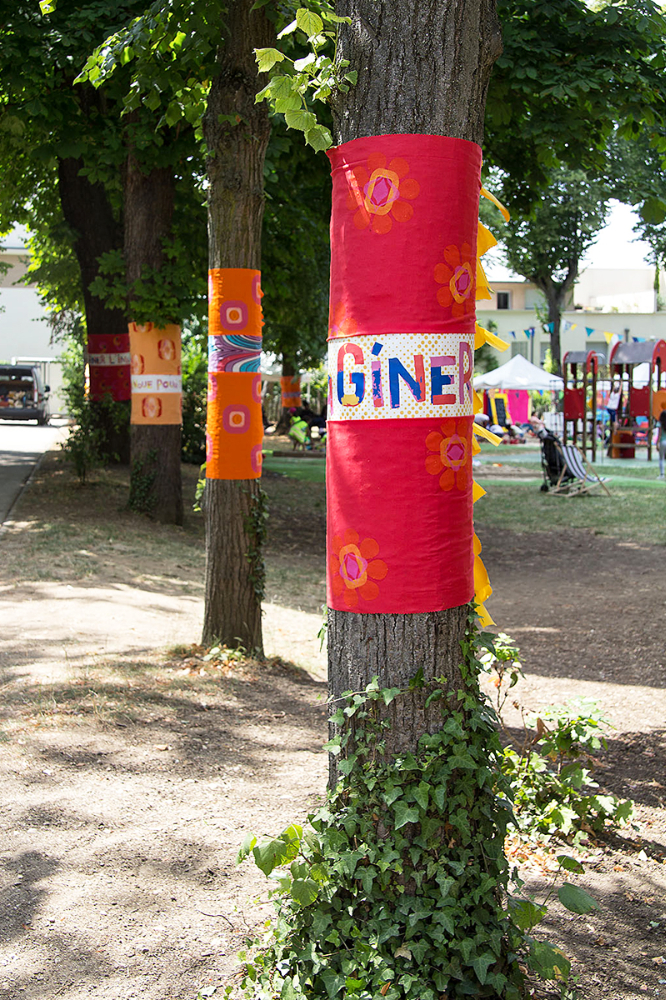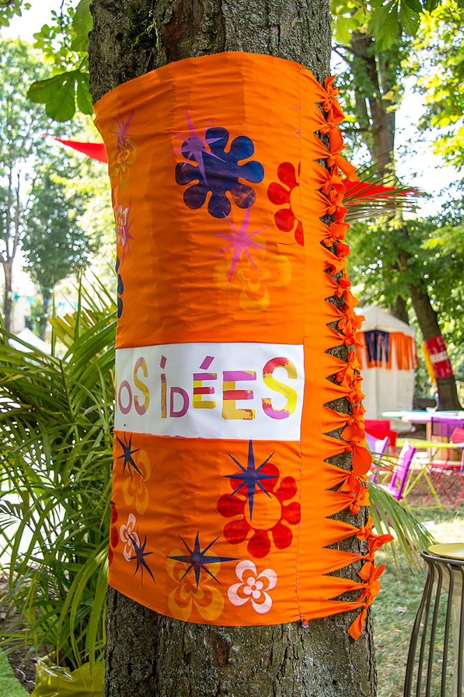 habillage de la totalité du parc dans ses espaces aménagées et ses objets naturels présents ({arbres, toiles à chaises longues, coussins, linéaires, Portes d'entrées, espace protégé, oeuvres totémiques tissées, voiles d’ombrage, chevalets ardoises})Artiste(s) et intervenant(s)
