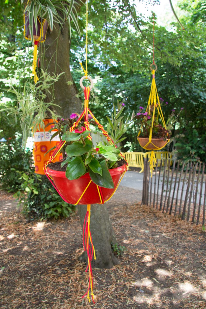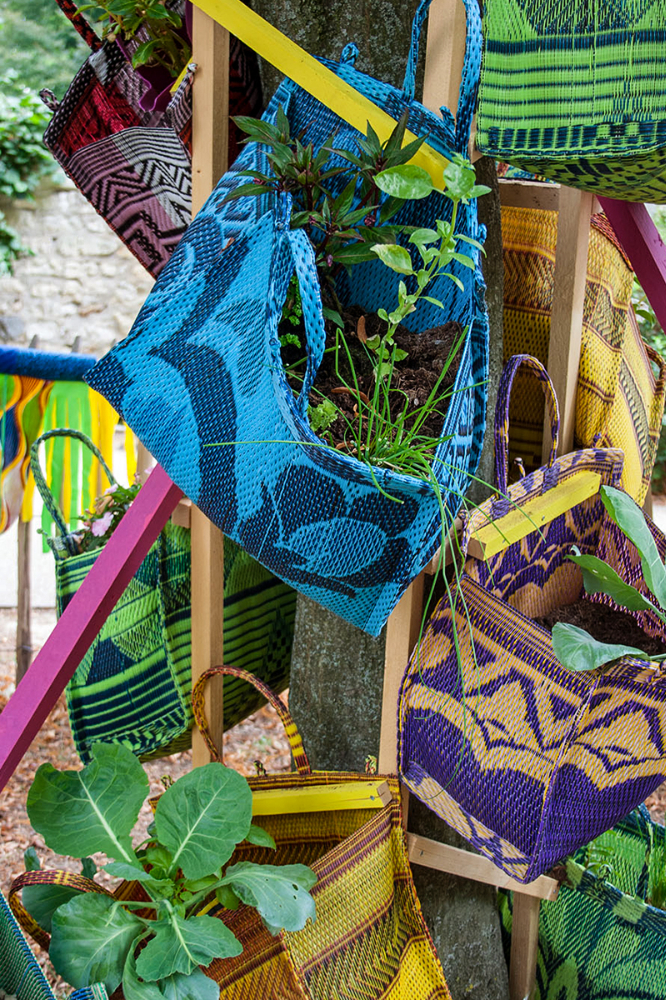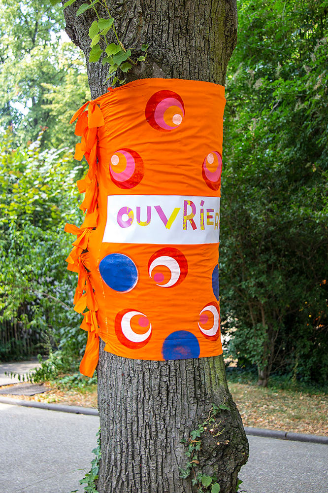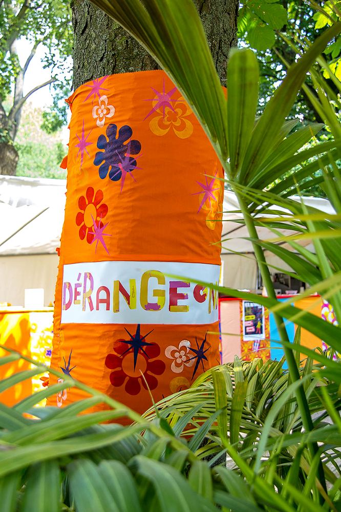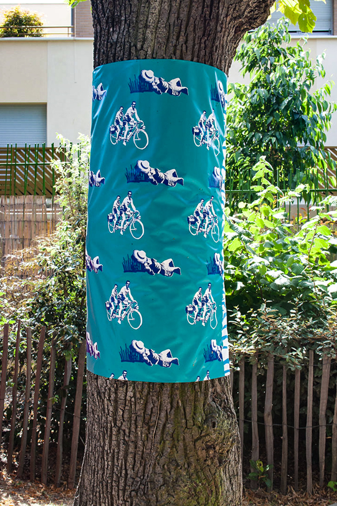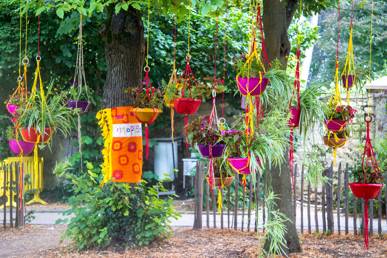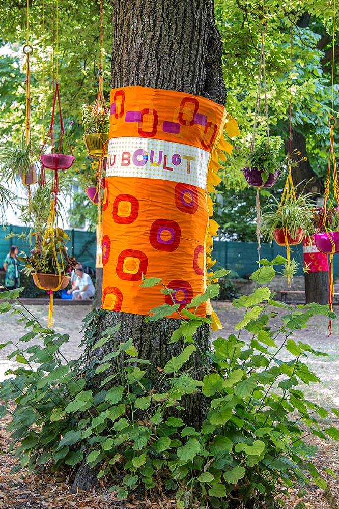 habillage de la totalité du parc dans ses espaces aménagées et ses objets naturels présents ({arbres, toiles à chaises longues, coussins, linéaires, Portes d'entrées, espace protégé, oeuvres totémiques tissées, voiles d’ombrage, chevalets ardoises})Artiste(s) et intervenant(s)