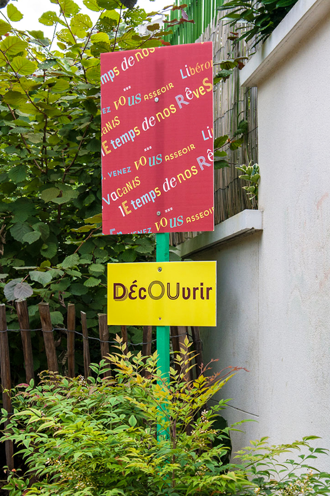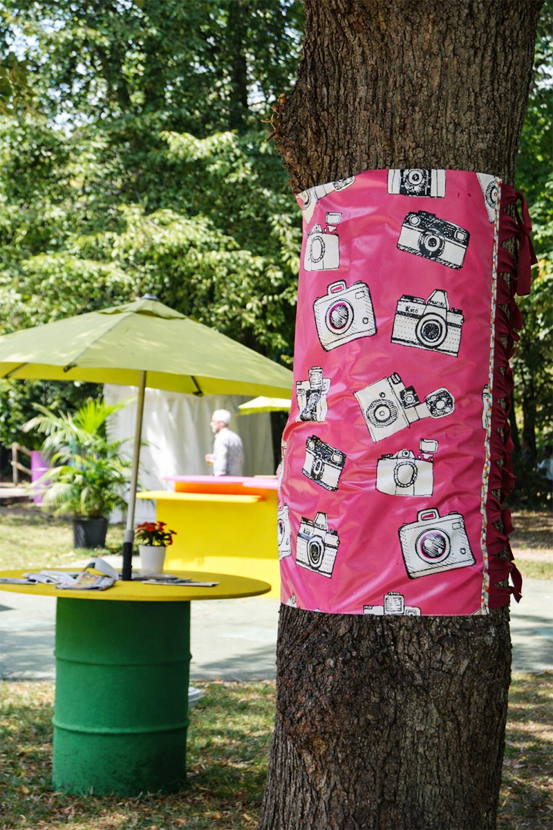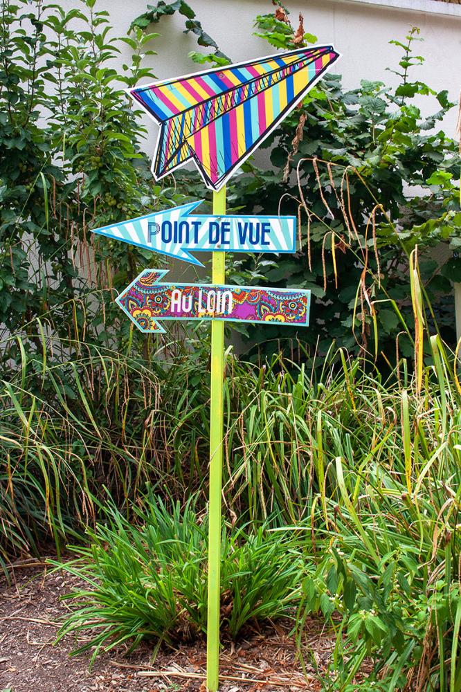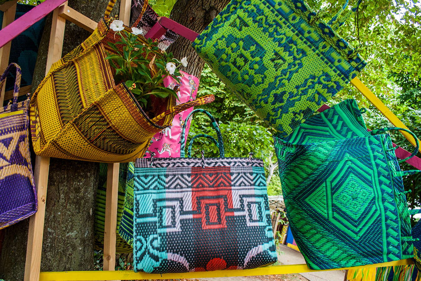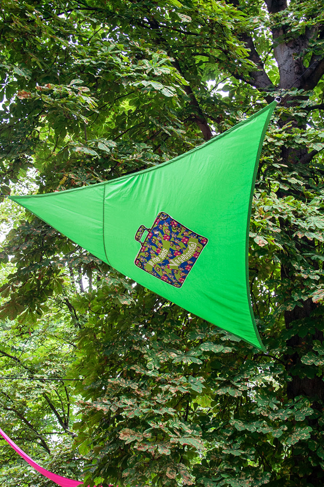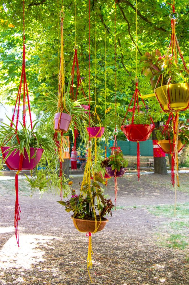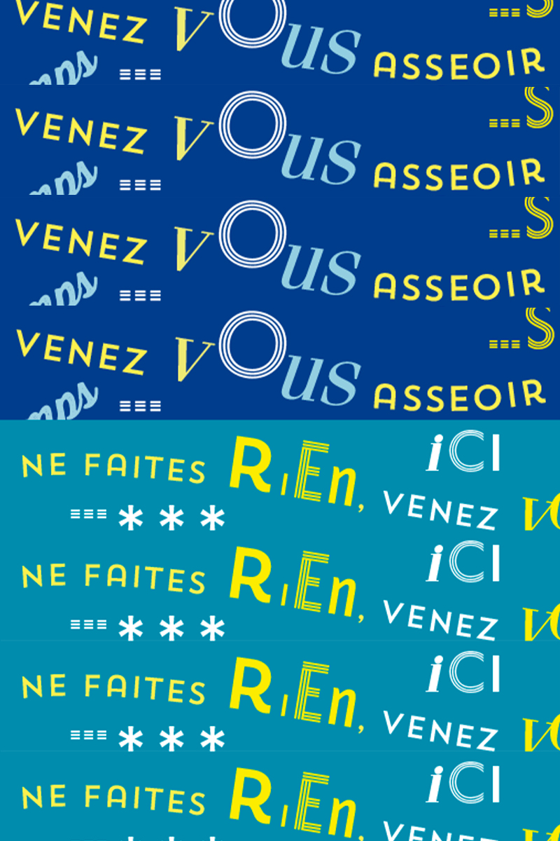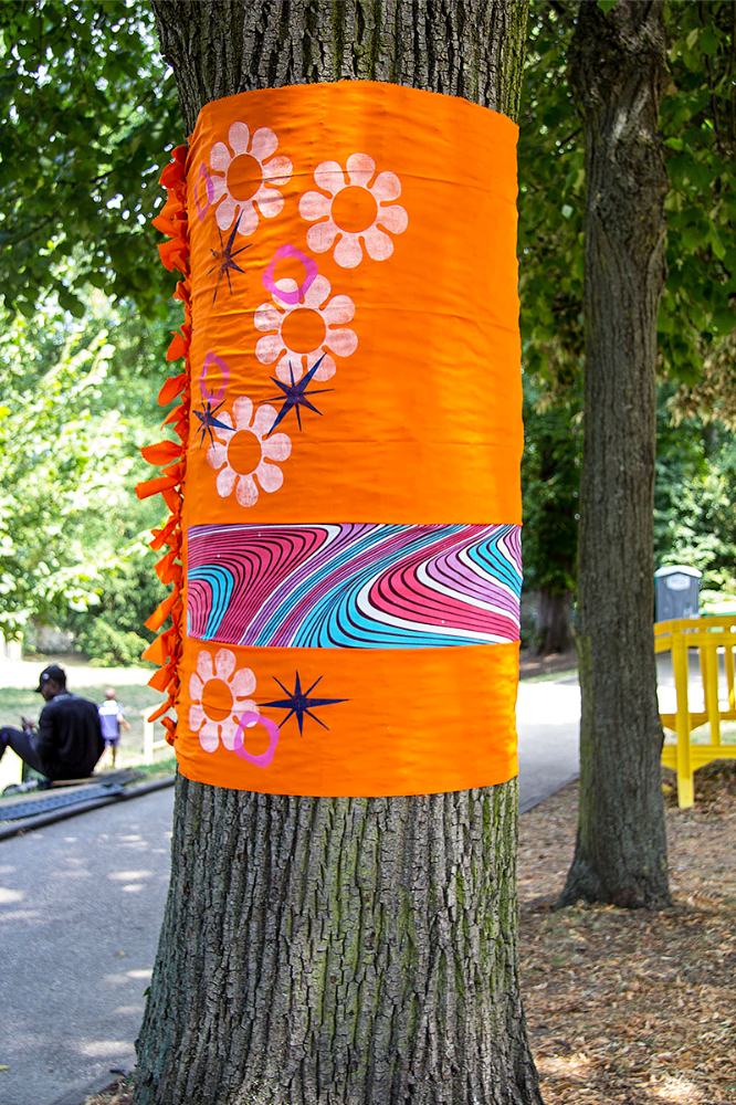 habillage de la totalité du parc dans ses espaces aménagées et ses objets naturels présents ({arbres, toiles à chaises longues, coussins, linéaires, Portes d'entrées, espace protégé, oeuvres totémiques tissées, voiles d’ombrage, chevalets ardoises})Artiste(s) et intervenant(s)