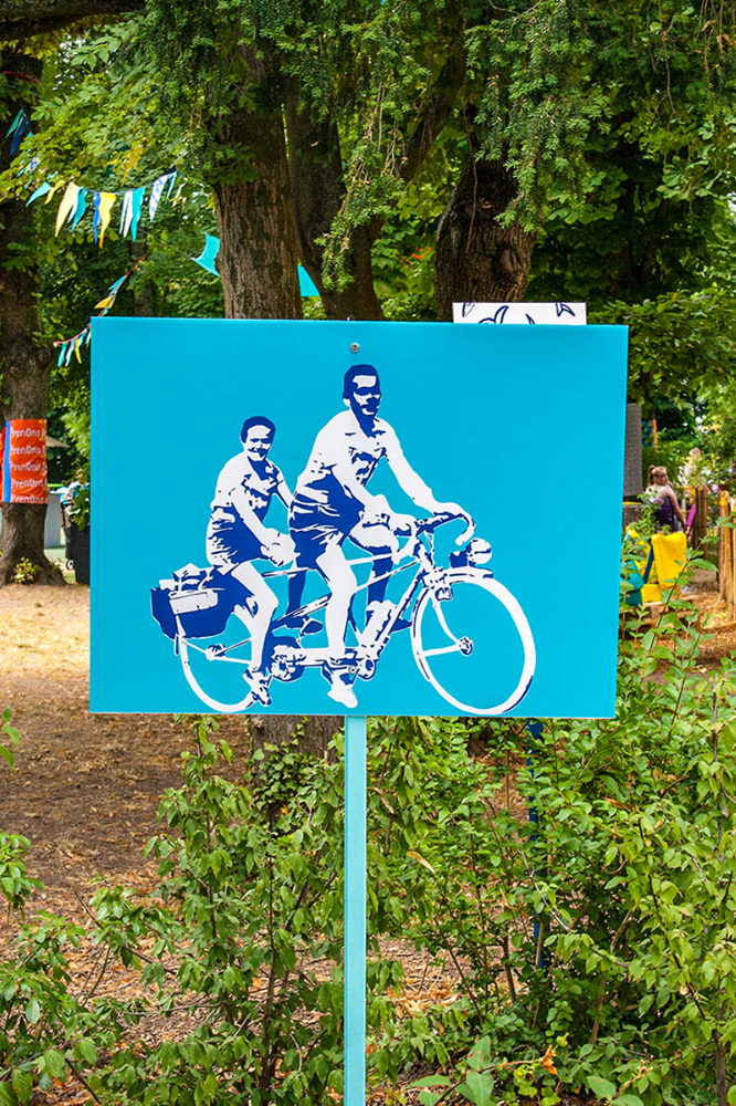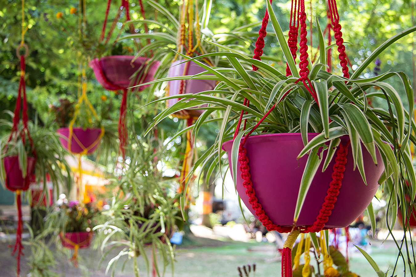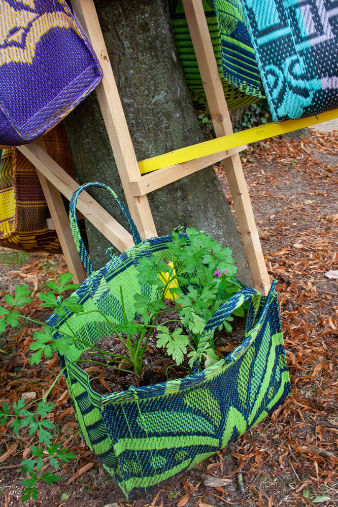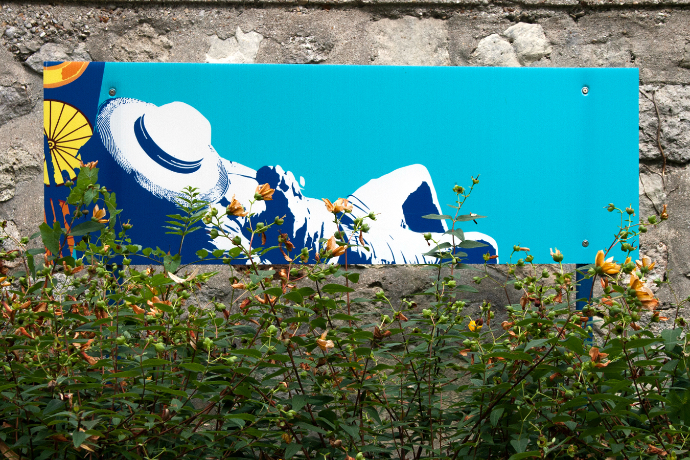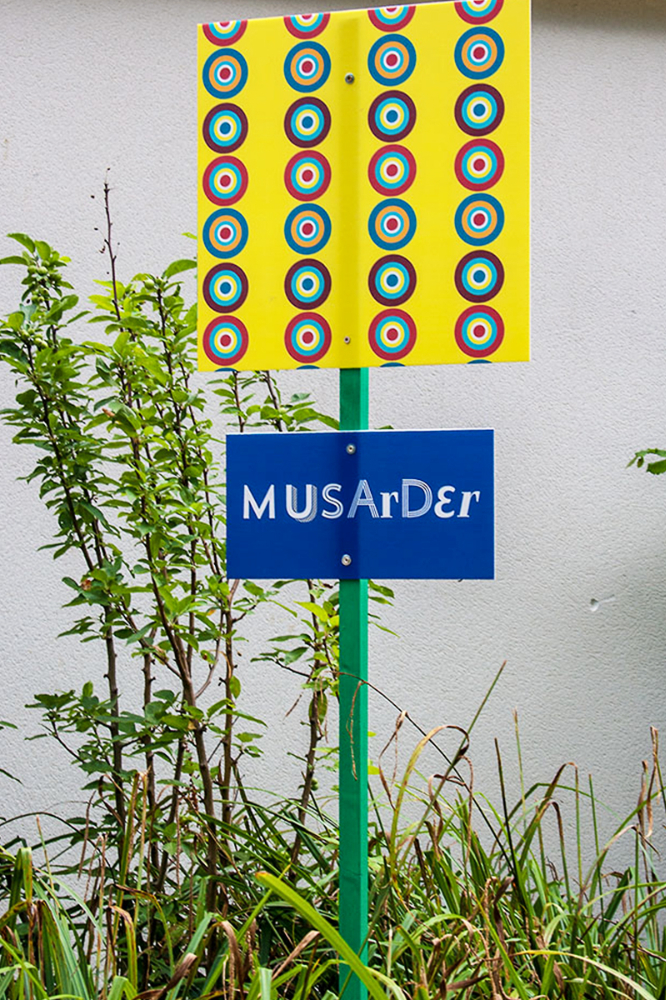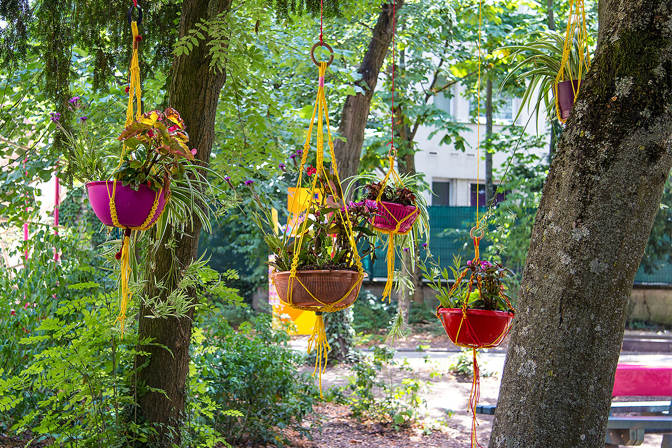 habillage de la totalité du parc dans ses espaces aménagées et ses objets naturels présents ({arbres, toiles à chaises longues, coussins, linéaires, Portes d'entrées, espace protégé, oeuvres totémiques tissées, voiles d’ombrage, chevalets ardoises})Artiste(s) et intervenant(s)