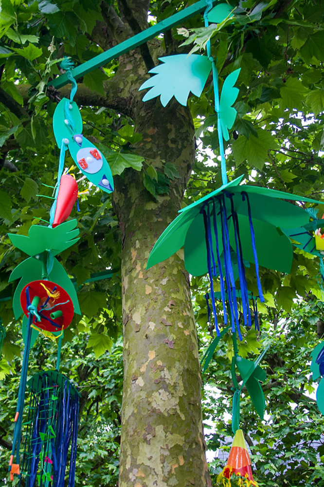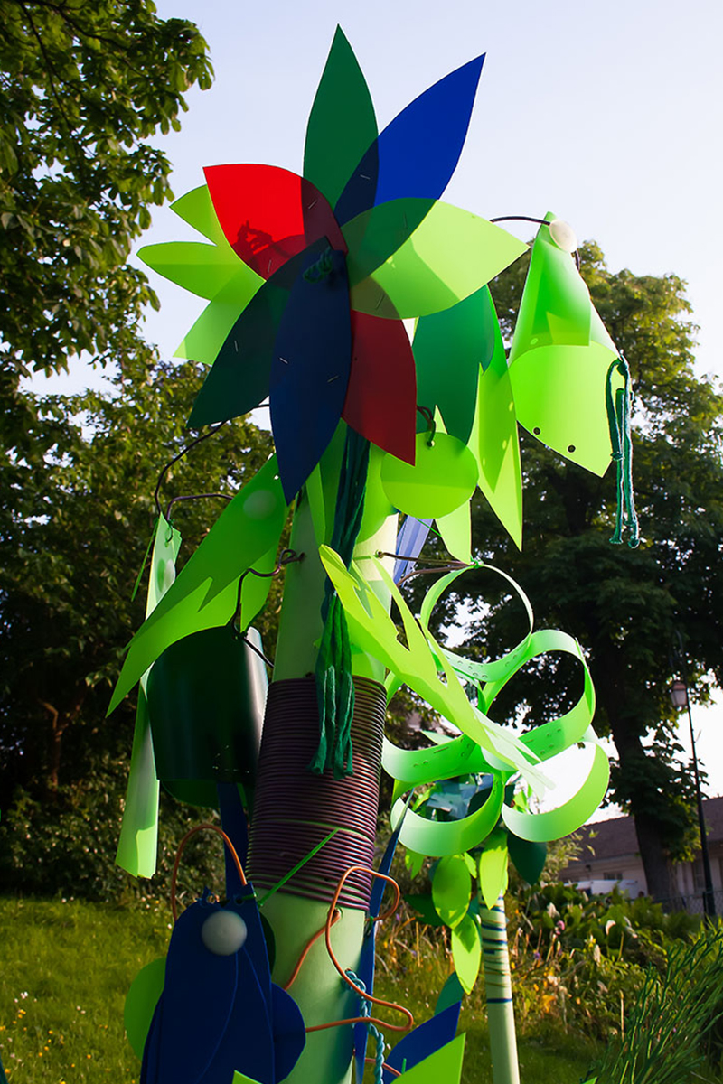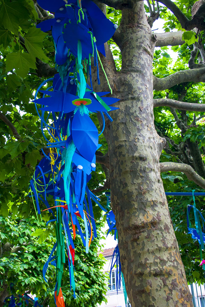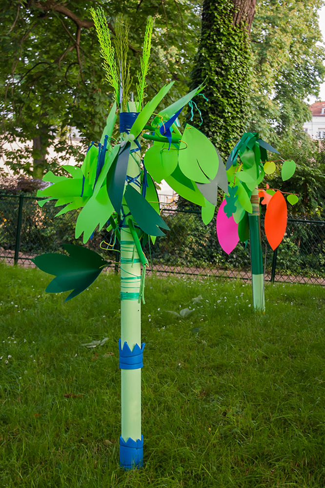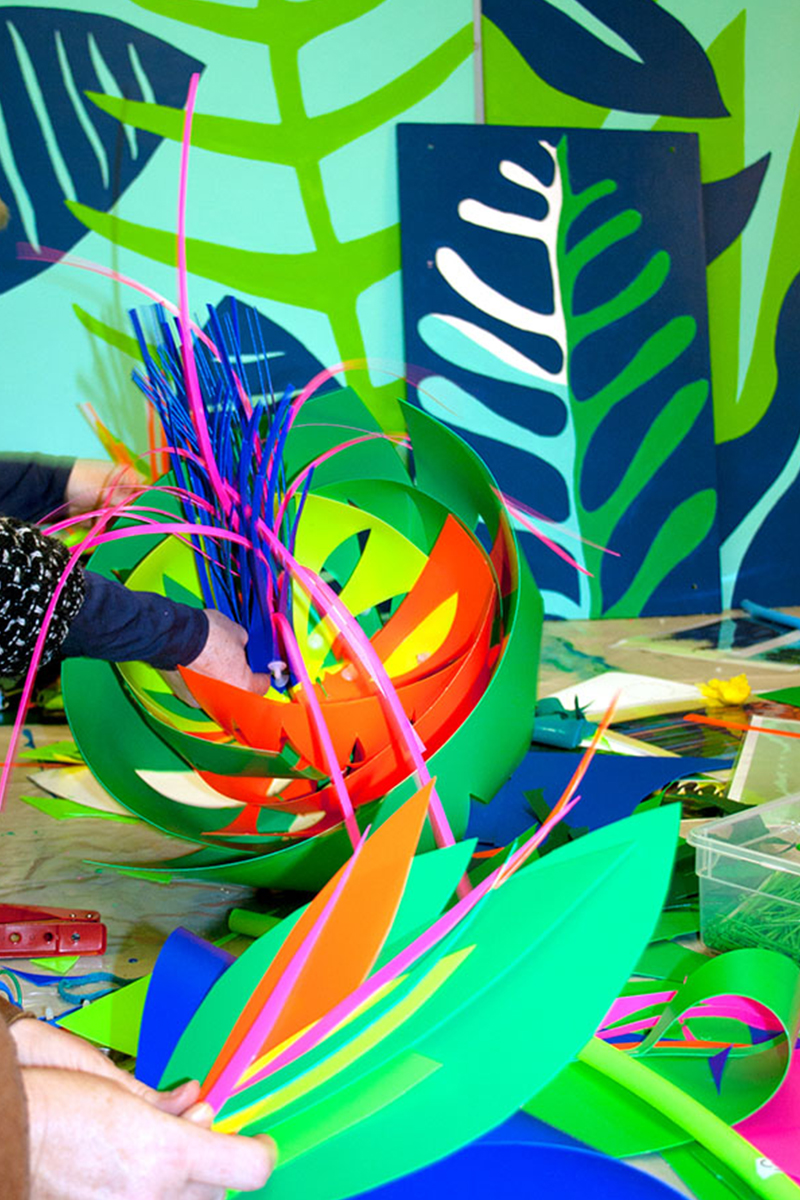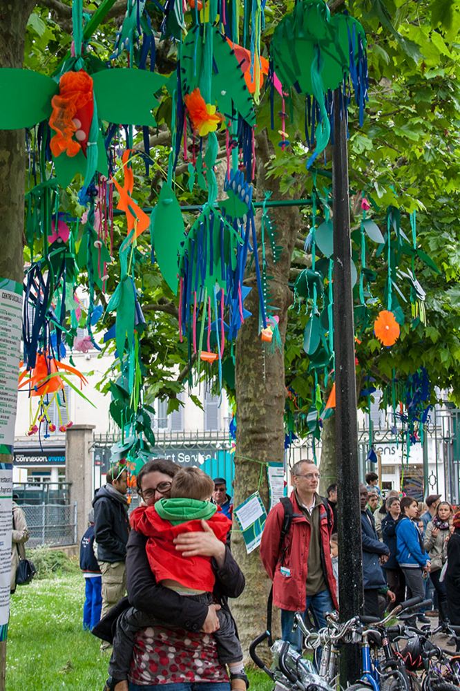 Nous réalisions des objets plastiques dans nos ateliers, et étions accueillis dans différents structures pour accompagner les publics dans la fabrication d’éléments scénographiques. Nos interventions s’étendaient sur 6 mois en amont de l’événement avec la rencontre de plus de 500 personnes de tous âges , dans des contextes et environnement multiples de la ville , autant pour des publics ciblés lors d’ateliers en intérieur, qu’en milieu ouvert avec des fabriques de rue.
