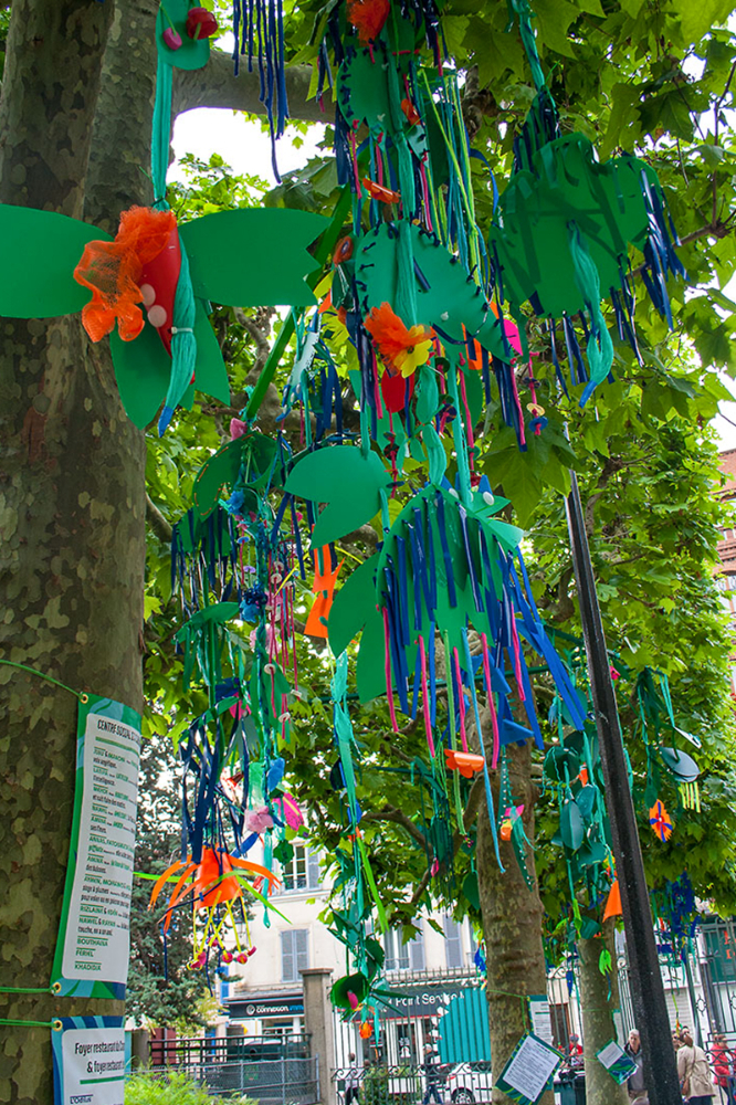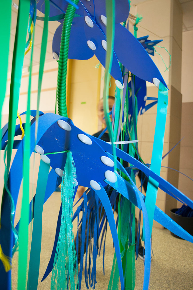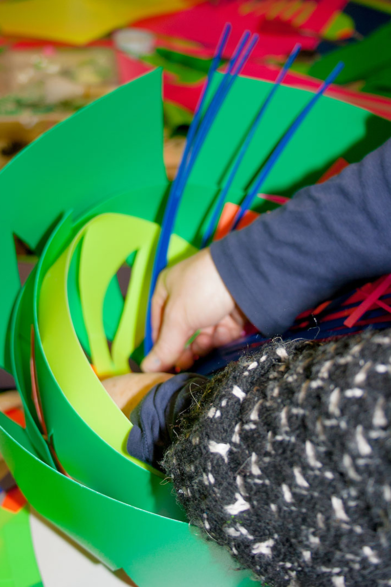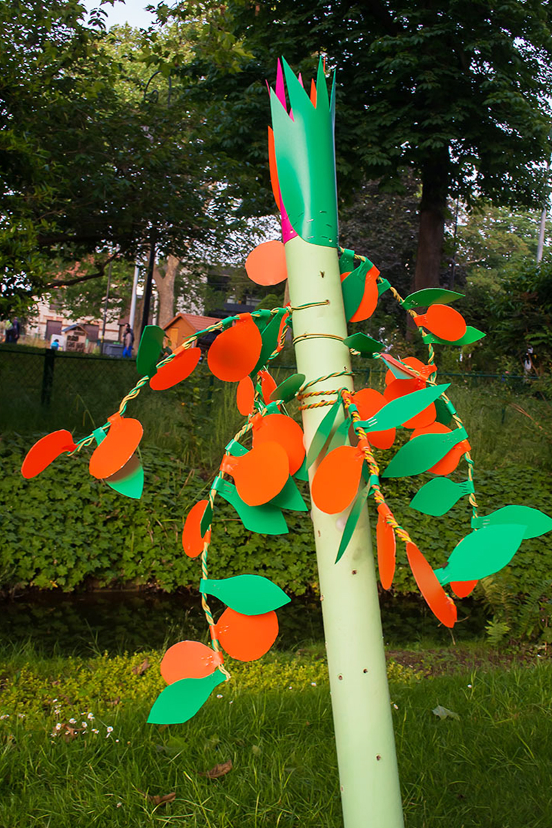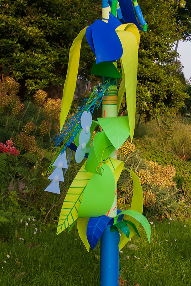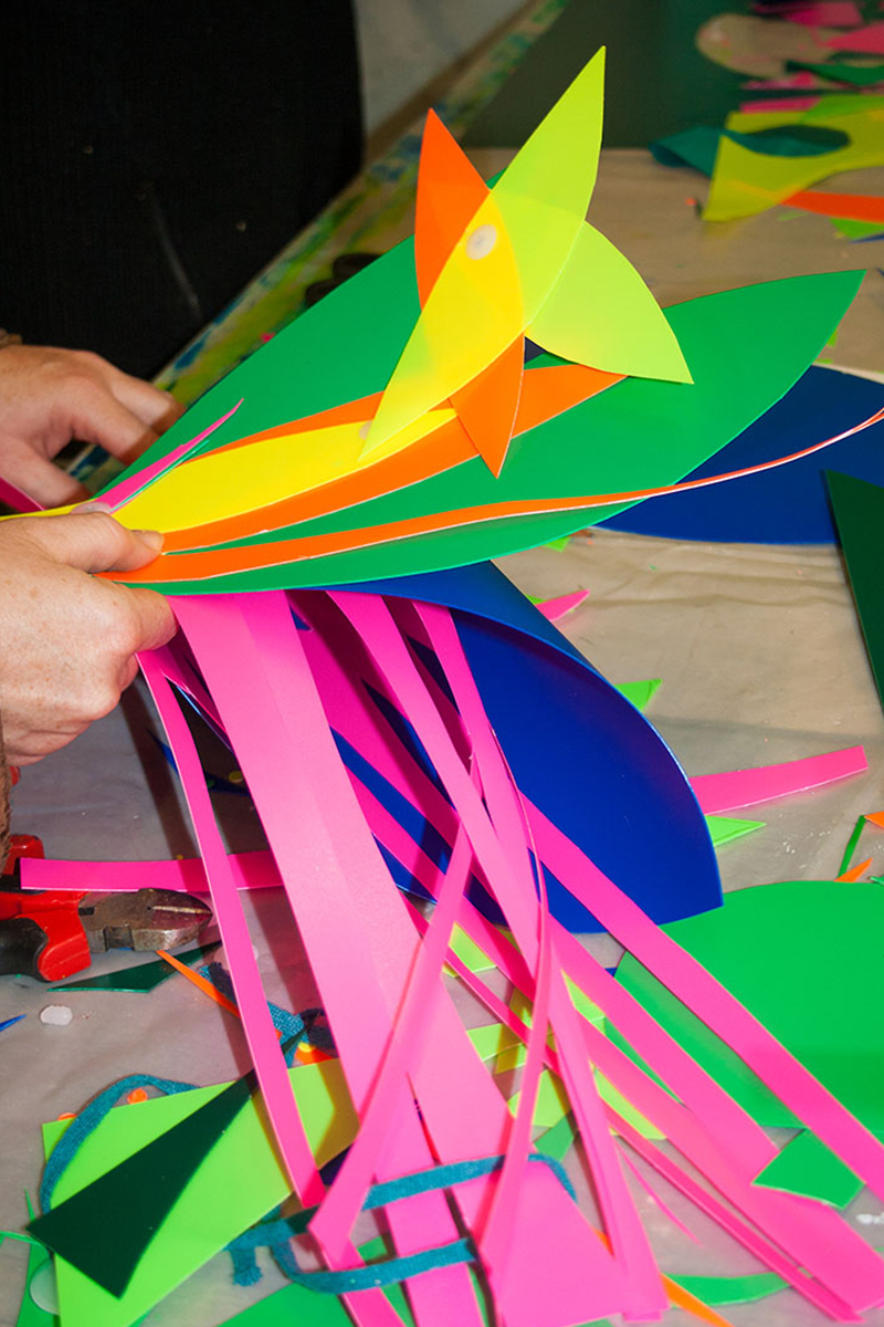 Nous réalisions des objets plastiques dans nos ateliers, et étions accueillis dans différents structures pour accompagner les publics dans la fabrication d’éléments scénographiques. Nos interventions s’étendaient sur 6 mois en amont de l’événement avec la rencontre de plus de 500 personnes de tous âges , dans des contextes et environnement multiples de la ville , autant pour des publics ciblés lors d’ateliers en intérieur, qu’en milieu ouvert avec des fabriques de rue.