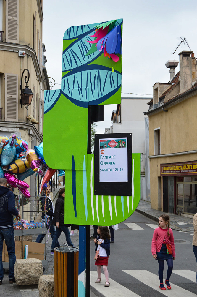 Pendant 7 ans, le festival des arts de rue Parade(s) à Nanterre a fait appel aux artistes du collectif pour imaginer une scénographie à la fois signalétique et participative. Nous avons ainsi travaillé autour de 6 thématiques et inspirations sur 7 ans pour habiller les rues du centre ville ancien et signaler tous les lieux de spectacles.